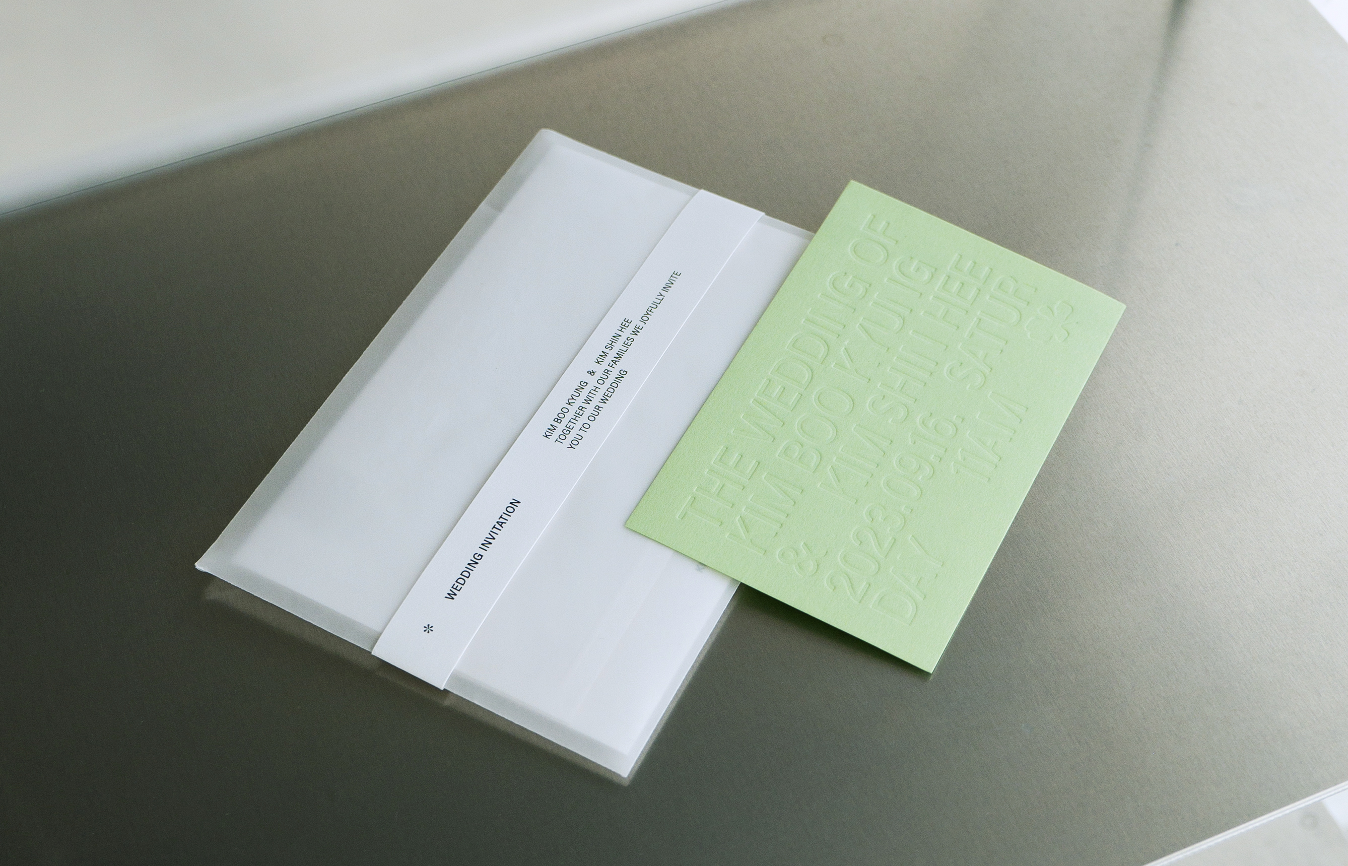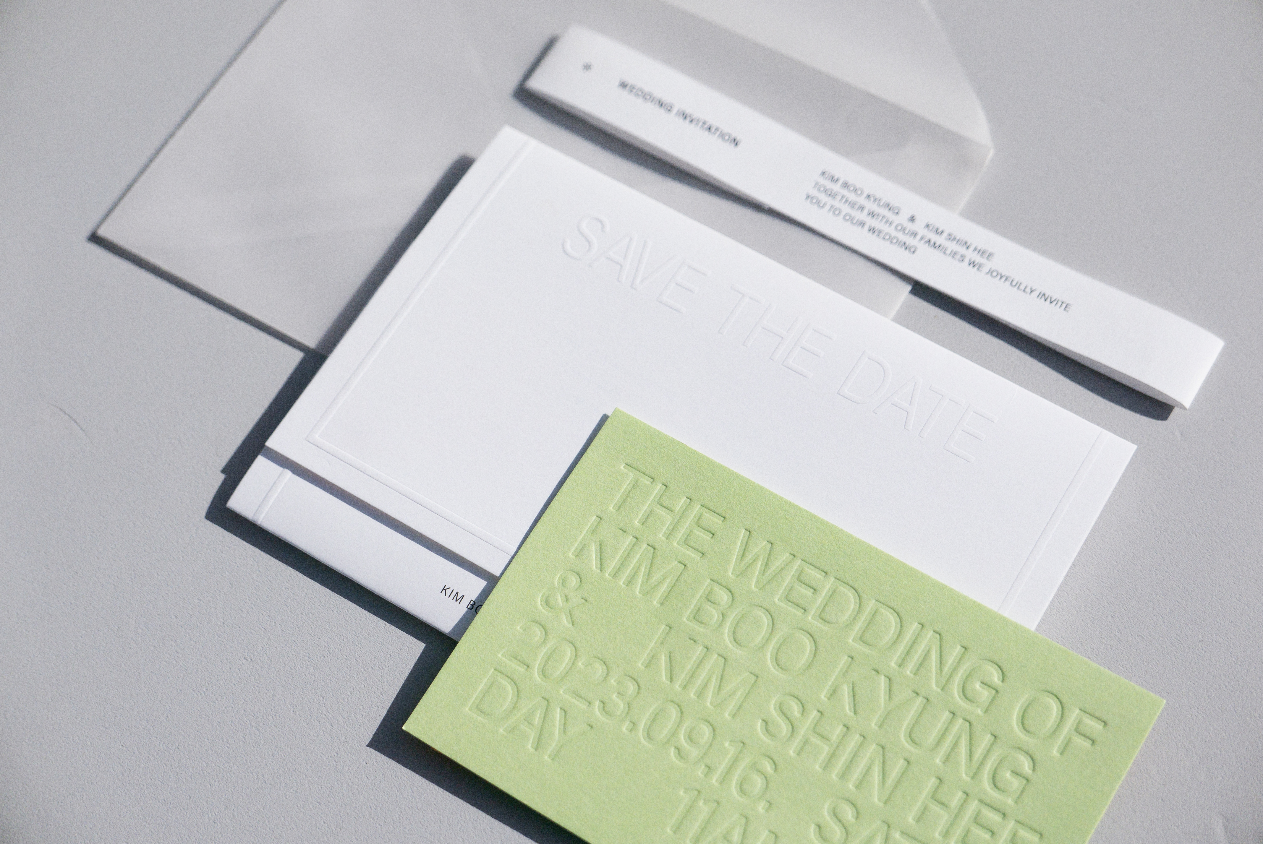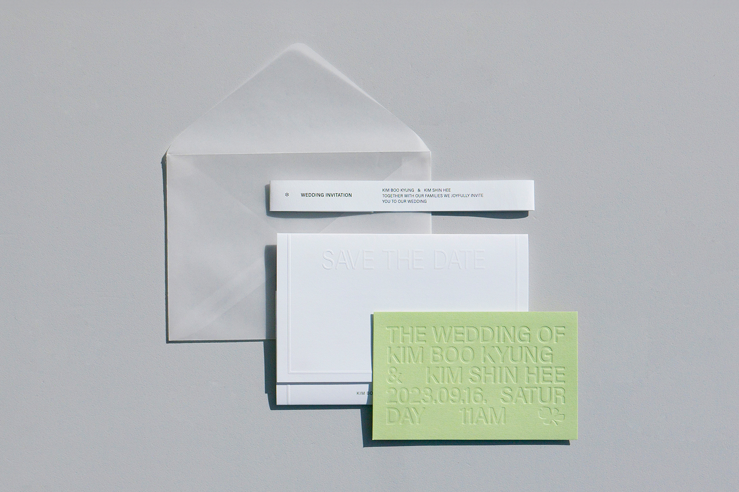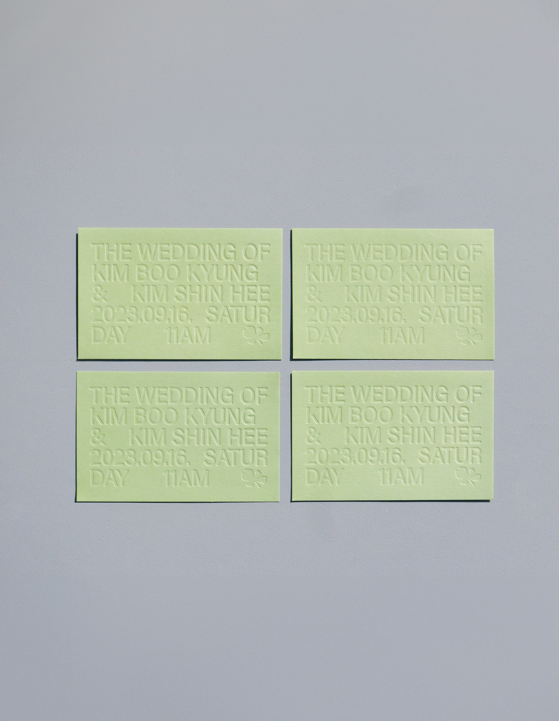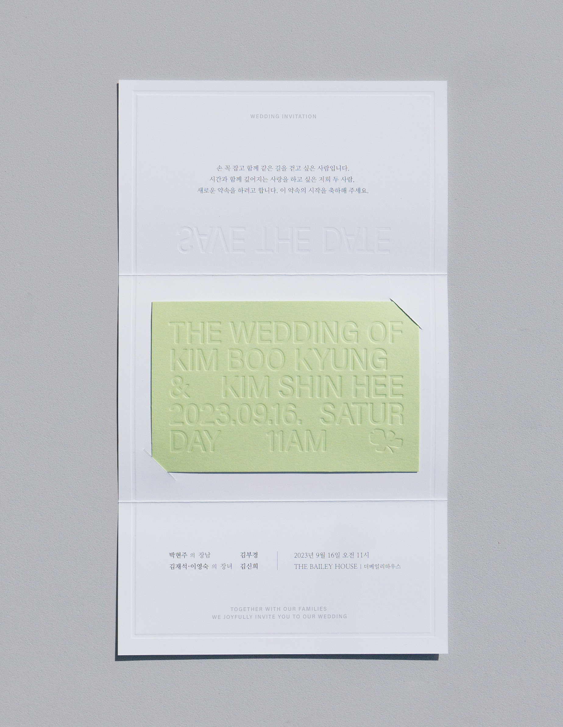 미니멀한 디자인을 선호하는 신부의 취향을 반영해 군더더기 없이 간결한 레이아웃으로 완성한 청첩장입니다. 전체적으로 깔끔한 화이트 톤을 유지하면서, 산뜻한 포인트 컬러를 더해 9월의 결혼식에 잘 어울리는 상큼하고 모던한 분위기를 표현했습니다.